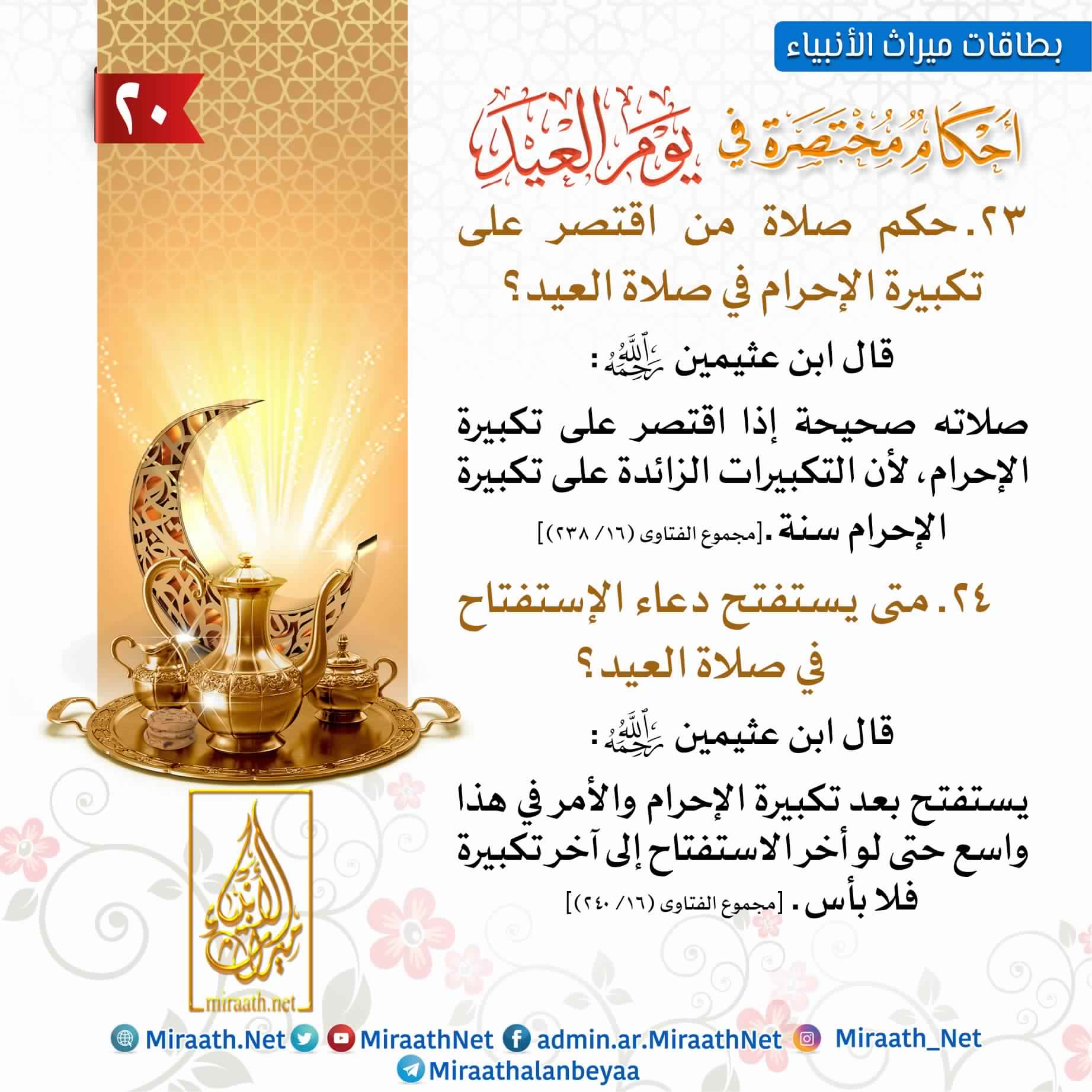 تتكون صلاة عيد الاضحى المبارك عدد سبعة تكبيرات خلال الركعة الأولى، غير تكبيرة الإحرام، وقبل قراءة سورة الفاتحة، ثم يتم التكبير 5مرات في الركعة الثانية. فرض كفاية عند الحنابلة، والإمامية، وسنة مؤكدة عند المالكية، والشافعية؛ وواجبة عند الحنفية. الحَنَفيَّة 6583 ((البحر الرائق)) لابن وجهُ الدَّلالةِ من الحَديثَينِ: الحنفية أنها فرض عين، والمالكية والشافعية على أنها سنة، والحنابلة على أنها فرض كفاية؛ والراجح قول الحنابلة، ومما يدل لذلك أمر النبي صلى. أدعية رمضان مستجابة بإذن الله. اختلف العلماء في حكم صلاة العيدين على ثلاثة أقوال : خُطبةُ صلاةِ العيدِ سُنَّةٌ، وهذا باتِّفاقِ المذاهبِ الفقهيَّة الأربعة: أنَّ صلاة العيد فرضُ كفاية، وإليه ذهب الحنابِلة، وهو قولُ أبي سعيدٍ الإصطخري من الشَّافعيَّة؛ قال ابنُ قدامة في المغني: نقدم لكم في هذا المقال معلومات مفيدة عن فضل الصاة علي سيدنا محمد وعلى اله وصحبه وسلم وصيغ مختلفه للصلاة عليه و معني الصلاة عليه صلوات ربي وسلامه عليه. حكم صلاة العيد 2016 على المسلمين. اجتماع الجمعة مع العيد أضيف بتاريخ: صلاة عيد الفطر فرض كفاية عند كثير من اهل العلم ويجوز التخلف من بعض الأفراد عنها ، لكن حضوره لها ومشاركته لإخوانه المسلمين سنة. كيف تصلي المرأة صلاة العيد في البيت.